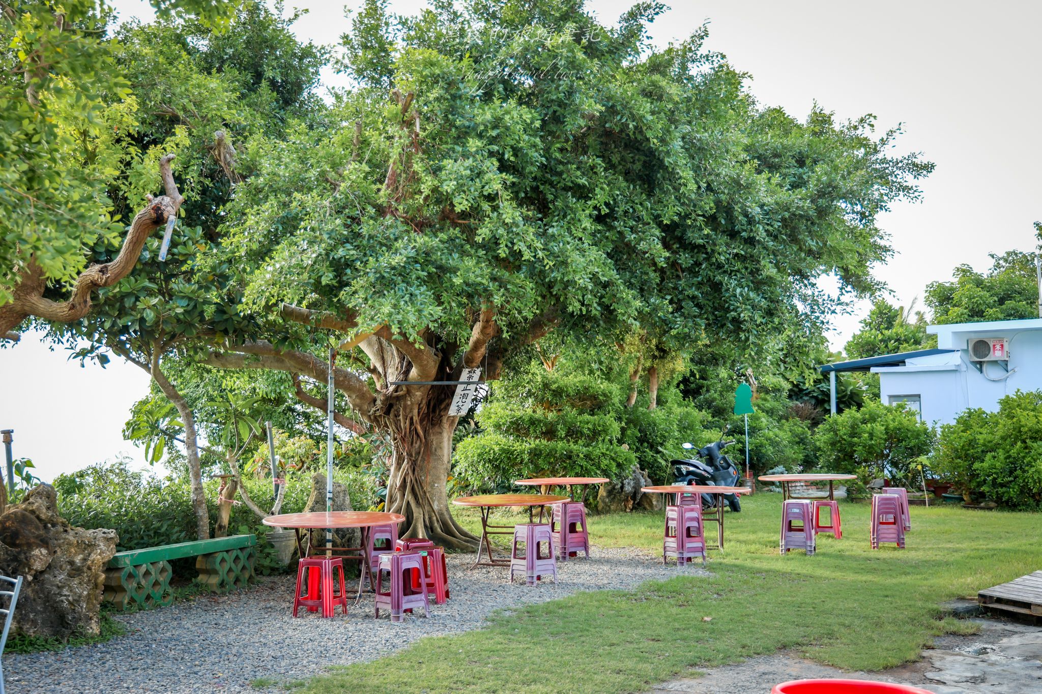 小觀山鹹粿空間佔地算是蠻大的,這裡的座位都是露天的座位,如果怕熱或是怕曬太陽的話,可以選擇樹下的座位去。